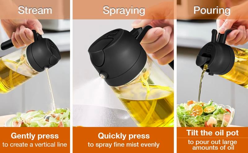 【Innovative Nozzle Design]】Precise control—a quick press creates a fine mist, while a slow press provides a steady spray. Whether you're preparing food in the kitchen or grilling outdoors, this reliable cooking oil sprayer is a must-have grilling accessory.